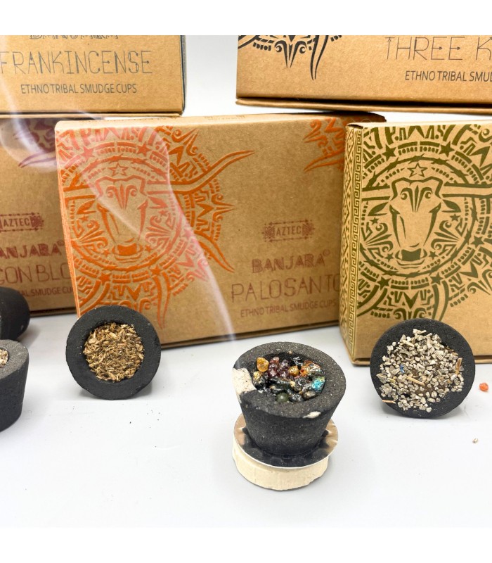 W zestawie znajduje się 6 żywicznych kubeczków zapachowych oraz delikatna kamienna podstawka, która podkreśla naturalny charakter produktu i ułatwia bezpieczne korzystanie z kadzidła.