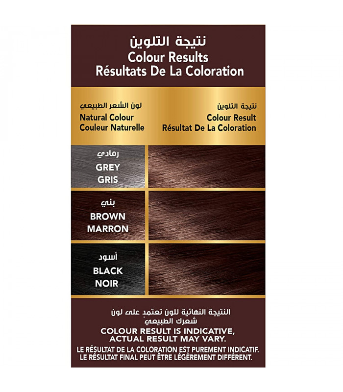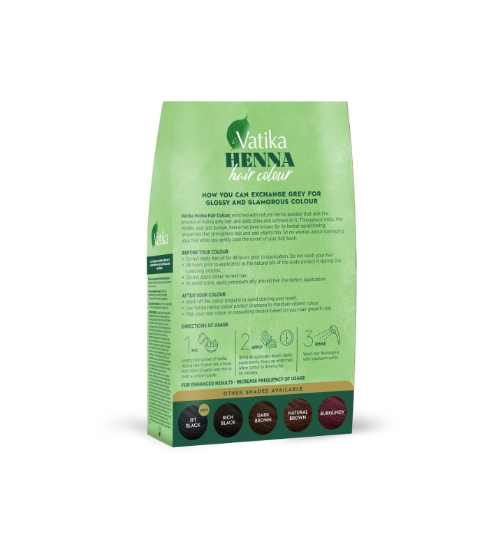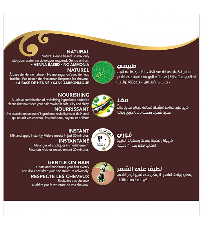 Składniki: proszek Lawsonia Inermis Leaf (henna), nadtlenek baru, fenylenodiamina, kwas cytrynowy, węglan magnezu, sól sodowa karboksymetylocelulozy, siarczyn sodu, Phyllanthus Emblica (Amla) proszek, Acacia Concinna (Shikakai) proszek, Azadiremta Indica (Liść Azadirachta) Proszek, proszek z liści Indigofera Tinctoria.