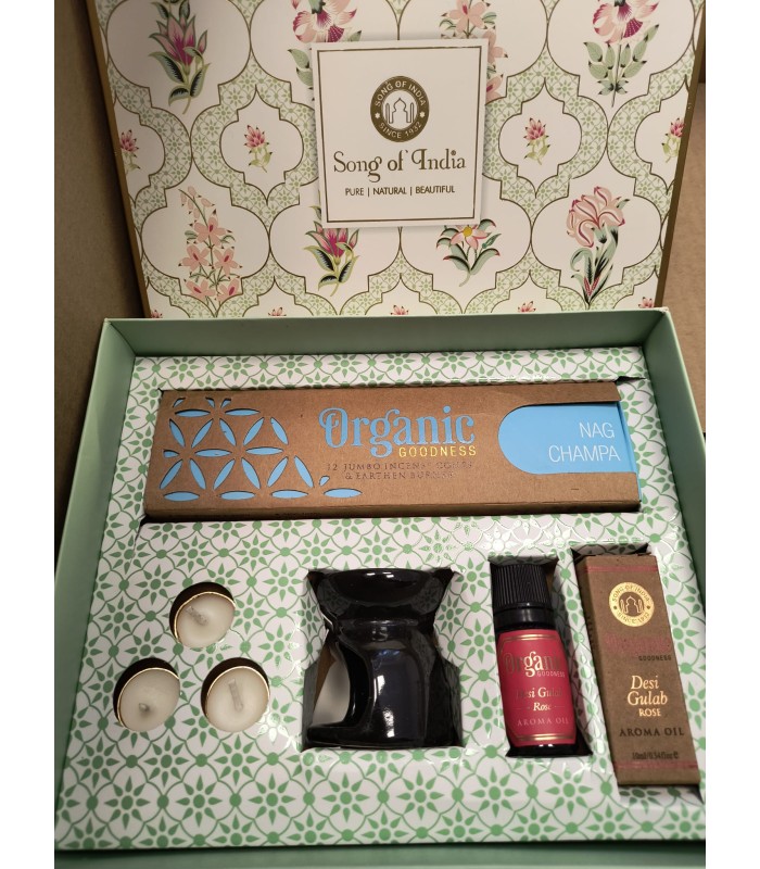 Zestaw prezentowy White Meditation Pooja od Song of India NAG CHAMPA– aromatyczny rytuał relaksu i modlitwy. W eleganckim pudełku znajdziesz olejek zapachowy Desi Gulab Rose, 3 tealighty bezzapachowe, stożkowe kadzidełka Nag Champa oraz kominek/podstawki do spalania, które tworzą nastrojową atmosferę. Idealny, organiczny prezent na wyjątkowe okazje.