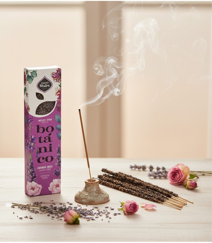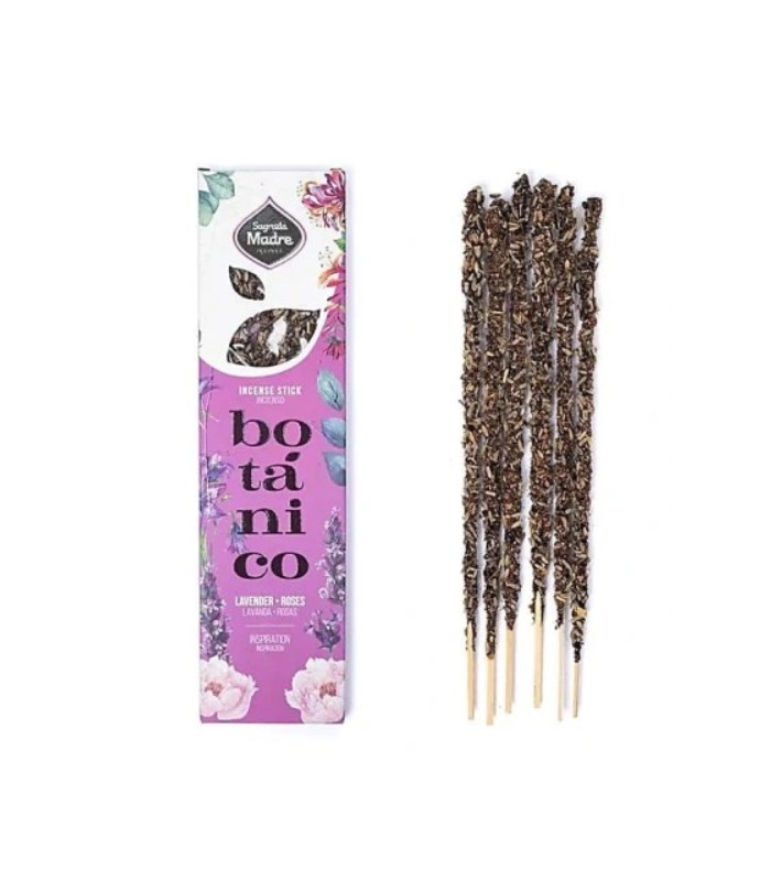 Kadzidełka botaniczne Sagrada Madre — lawenda i róża, 20 g. Delikatna, kwiatowo-ziołowa kompozycja stworzona z naturalnych składników, doskonała do relaksu, medytacji i odświeżenia wnętrza; długo i czysto się palą.