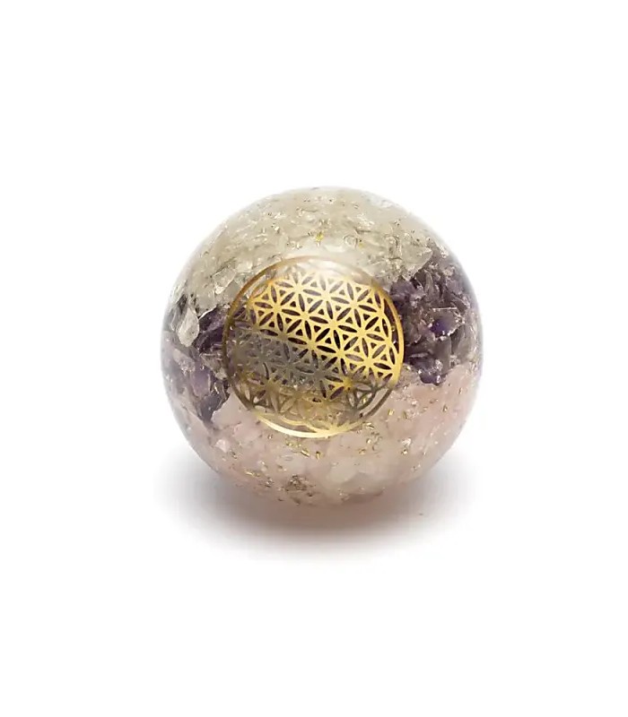 This orgonite sphere contains small pieces from the golden triangle: rose quartz, amethyst and rock crystal, embedded in the resin matrix. Within crystal therapy, these three minerals are often used together for their complementary qualities. Rose quartz is associated with softness and emotional openness, amethyst with clarity and insight, and rock crystal with balance and the amplification of intention.