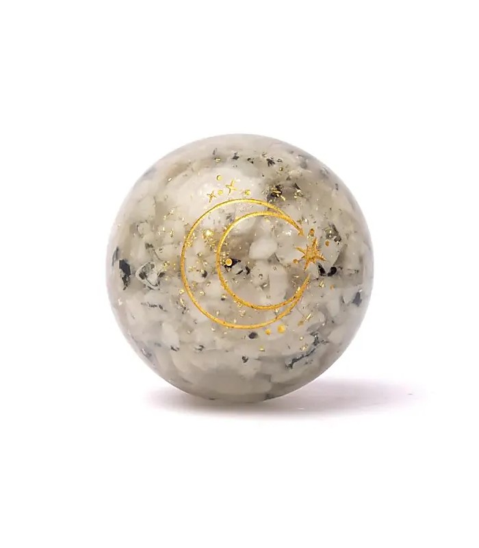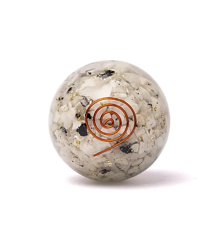 Inside this orgonite sphere, small chips of moonstone are suspended within the resin matrix. Moonstone is prized by crystal therapists for fostering intuition and emotional rhythm. Its pearly sheen mirrors the waxing and waning lunar cycle and is often linked to the sacral and third-eye chakras, where instinct and imagination meet.