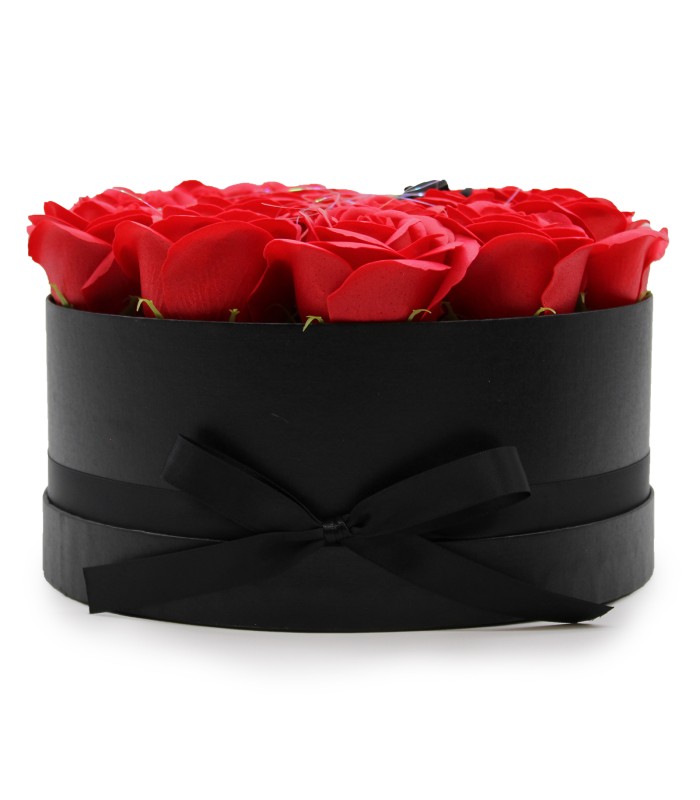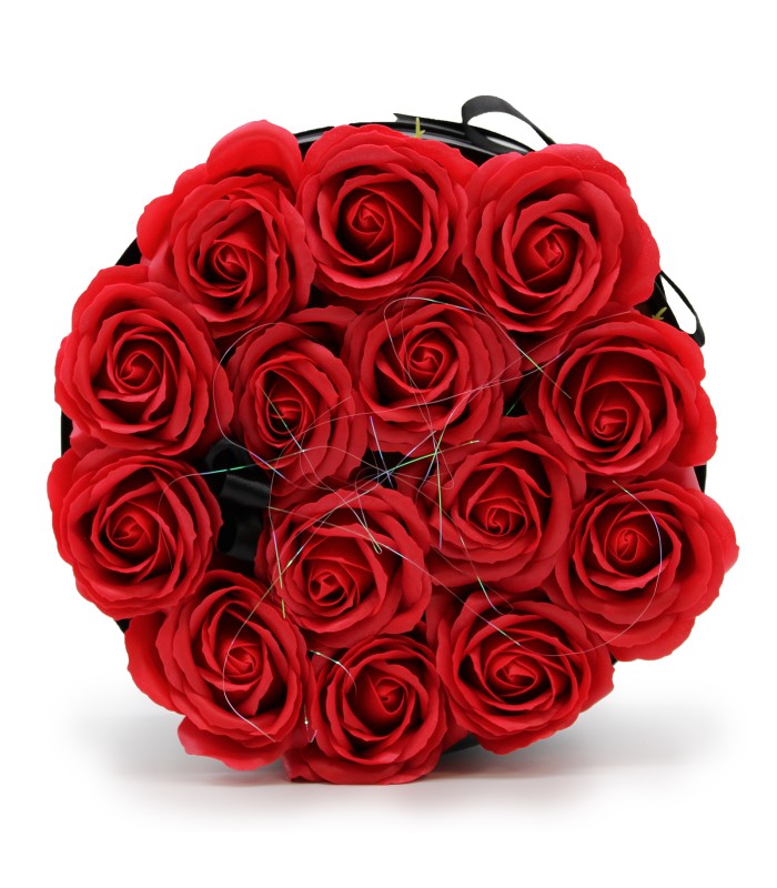 Bukiet mydlanych kwiatów – 14 czerwonych róż (okrągły) wygląda niemal jak prawdziwe kwiaty i zachwyca eleganckim wyglądem. To wyjątkowy i efektowny upominek, który łączy piękno bukietu z relaksującą kąpielą.
