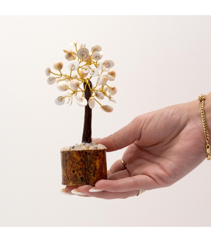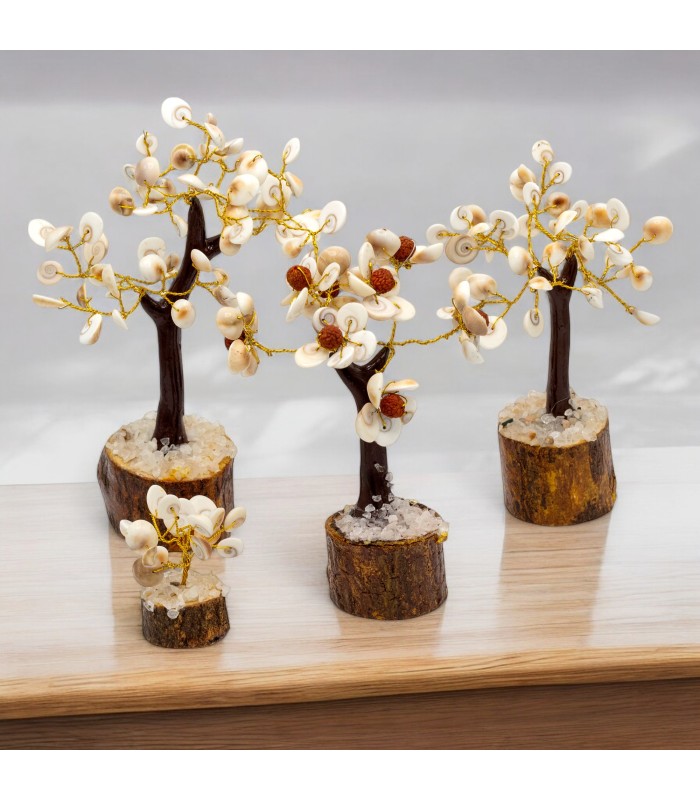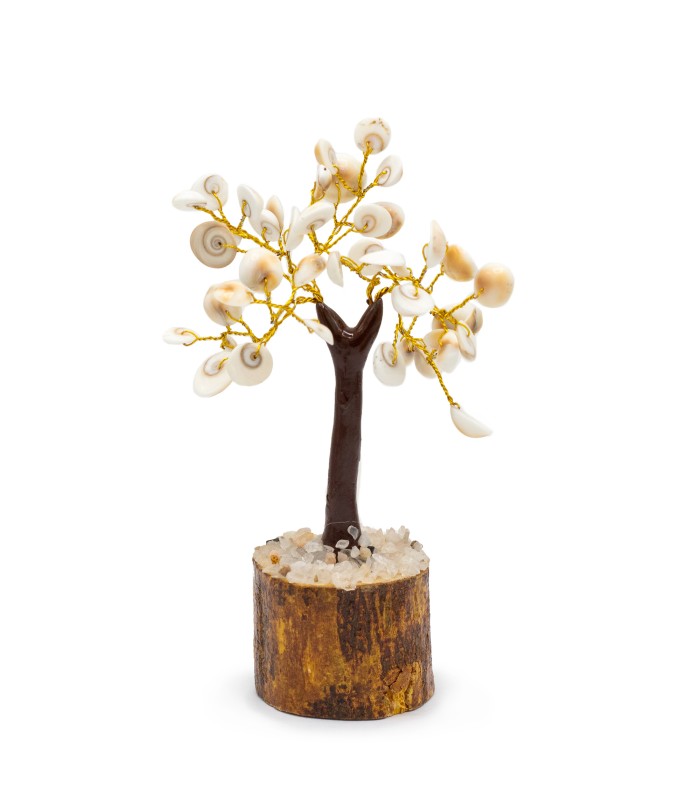 To wyjątkowe drzewko ozdobne zostało wykonane z 45 pięknych kamieni Gomati Chakra. Każdy z nich został ręcznie wyselekcjonowany z rzeki Gomati w Indiach i wyróżnia się charakterystycznym spiralnym wzorem, który symbolizuje cykle życia, rozwój oraz przepływ energii.