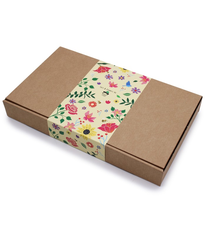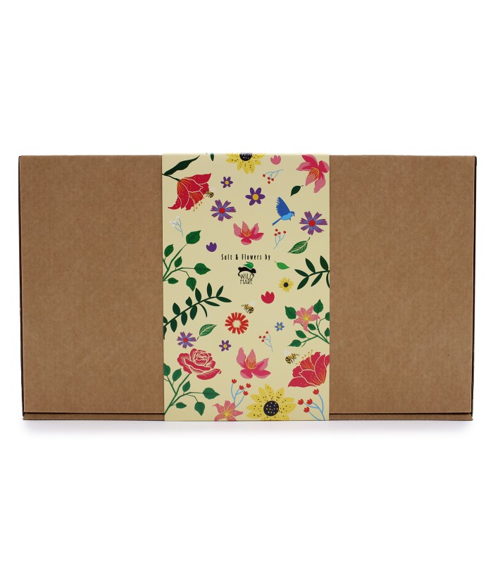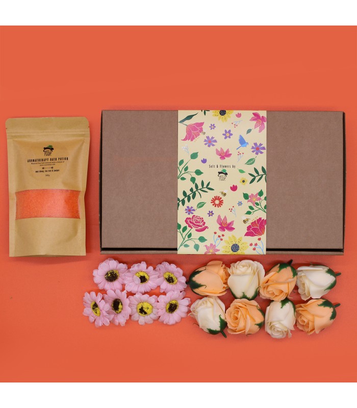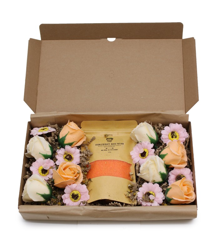 W eleganckim pudełku znajdziesz starannie dobrane elementy kąpielowe: kolorystycznie dopasowaną sól do kąpieli oraz dekoracyjne róże i słoneczniki z mydła. Całość tworzy wyjątkowy zestaw, który zachwyca wyglądem i zamienia codzienną kąpiel w luksusowe doświadczenie.