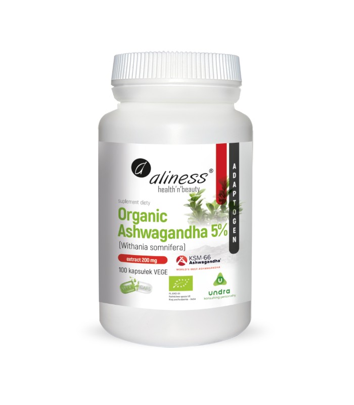 Organiczny ekstrakt Ashwagandha KSM-66 pozyskiwany wyłącznie z korzenia Withania somnifera, standaryzowany na 5% witanolidów